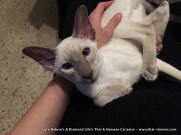 Prince c’est immediatement plu a la maison et a noué une enorme amitié avec Jolenne , Lilac comme lui et presque du meme age. Ils jouent comme des dingues tous les deux, courent, volent, roulent, rebondissent, glissent et finalement dorment ensemble…C’est interessant de voir la difference entre eux d’eux Siamois et Thai de la meme couleur et presque du meme age.